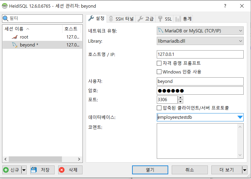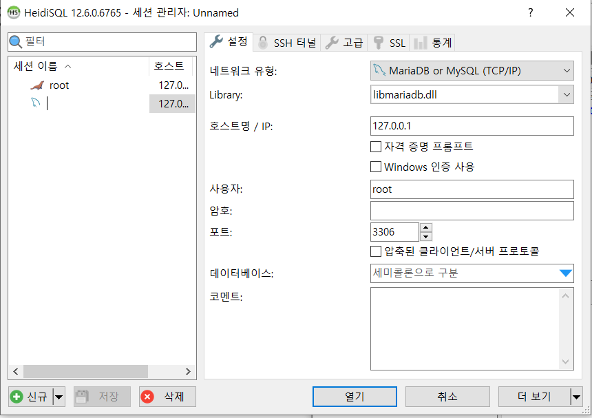 윈도우 > HeidiSQL신규 클릭정보 입력후 열기
