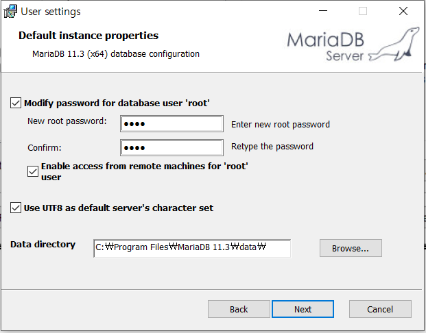 - root 사용자는 MariaDB의 모든 작업을 할 수 있기 때문에 실습에 필요한 일반 사용자를 생성하고 생성한 일반 사용자에 적합한 권한을 부여